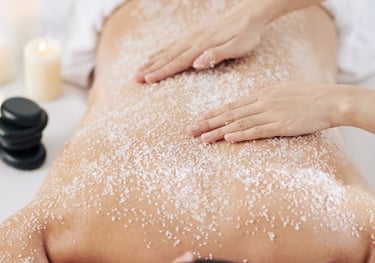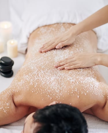 Scrub body massage is a rejuvenating spa treatment that combines exfoliation and massage to refresh the skin and promote relaxation. It involves applying a scrub made of natural ingredients like sea salt, sugar, or coffee grounds to remove dead skin cells, leaving the skin smooth and radiant ⁽¹⁾. After exfoliation, a soothing massage helps improve circulation and hydration, enhancing the overall experience⁽²⁾. This treatment is ideal for skin renewal and stress relief.